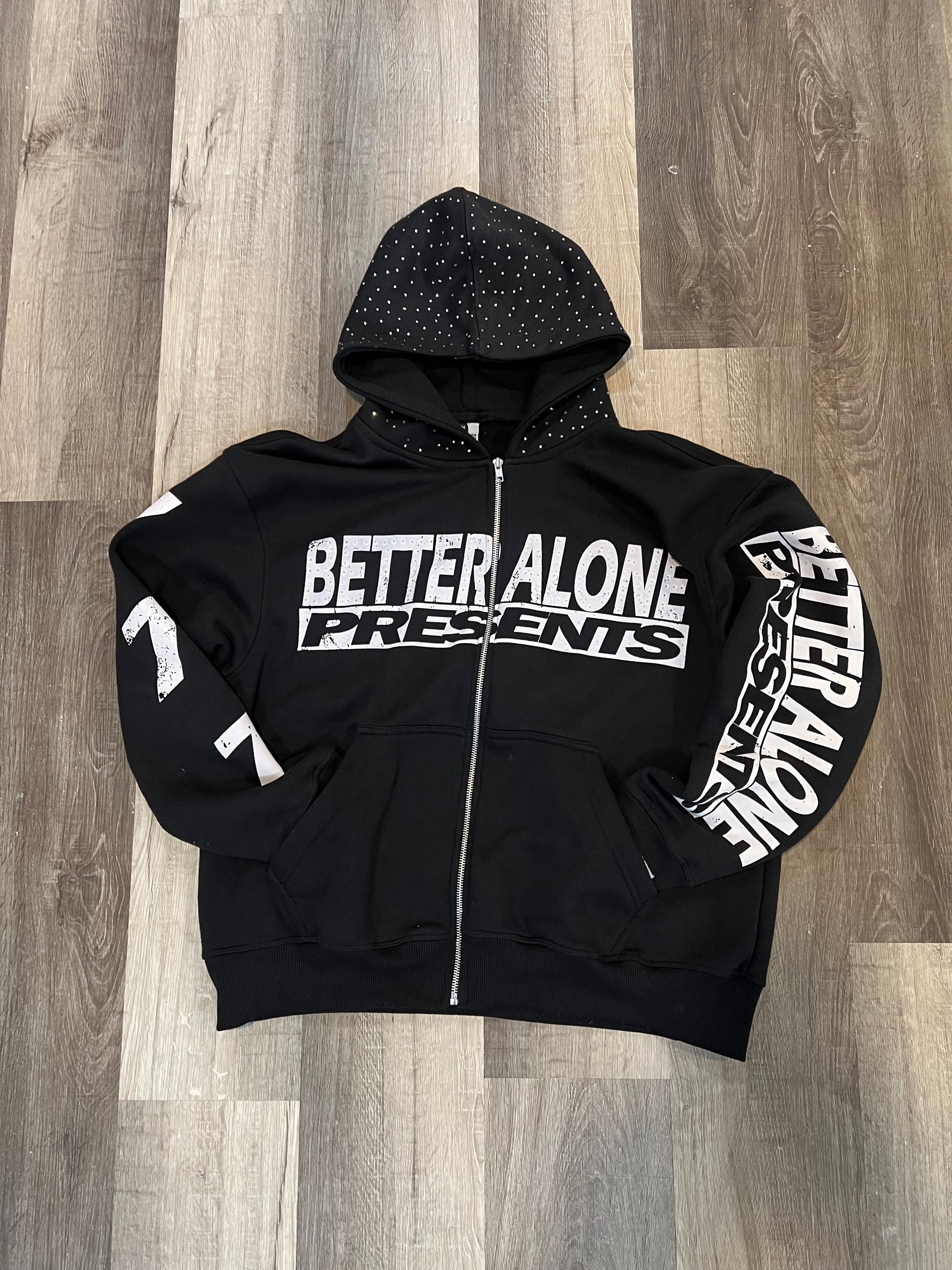 Designed with a relaxed, boxy fit, this piece features the bold “Better Alone Presents” screen print across the front in crisp white, elevated with shimmering rhinestone detailing on the signature “Better Alone” logo. The attention to detail continues with a matching white “Better Alone Presents” logo screen printed along the left sleeve, while the right sleeve showcases the striking “7 7 7” slogan—adding balance and edge to the design.
