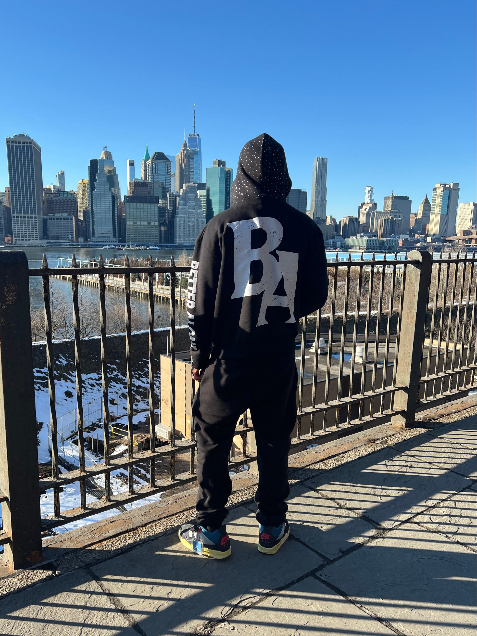 The hood is fully embellished with rhinestones, catching light from every angle and giving the hoodie an unmistakable premium feel. On the back, the iconic “BA” logo stands strong, tying the entire look together.